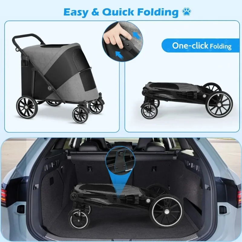 Built with a resilient yet featherlight frame, this collapsible pet stroller folds in moments, slipping easily into car trunks or home corners. Its dual-entry system—front and back access—ensures effortless entry for even the most cautious pups. Inside, the roomy compartment lets two dogs sprawl or snuggle, wrapped in tough, weather-defiant fabric that wards off sun, breezes, or light drizzle. Four rugged, all-terrain wheels glide over pavement or paths, making this dog carriage a go-anywhere solution for active pet parents.